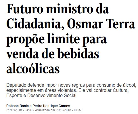 é como se refere à grandeza do futuroministério da cidadania que concentrará desenvolvimento social cultura e esporte. Em entrevista ao jornal o globo terra disse que a redução do horário de venda deste tipo de produto em restaurantes e bares é uma coisa que pode se pensar. Para o osmar terra mdb rs futuro ministro da cidadania a limitação da venda de bebidas alcoólicas pode reduzir os níveis de violência.